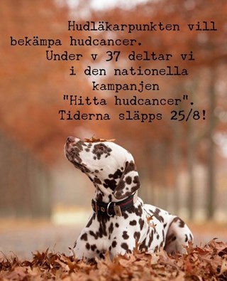 Hudläkarpunkten deltar i den nationella kampanjen Hitta Hudcancer som pågår under v 37. Den anordnas av Privatpraktiserande dermatologers Förening. Mer info finns på www.hittahudcancer.nu