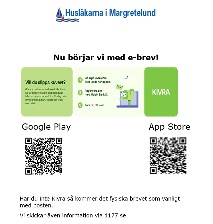 Har du inte Kivra så kommer det fysiska brevet som vanligt med posten. Vi skickar även information via 1177.se