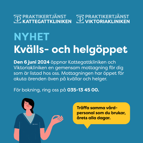 Den 6 juni 2024 öppnar Kattagattkliniken och Viktoriakliniken en gemensam Helg- och kvällsmottagning. Nu kan du träffa samma vårdpersonal som du brukar, även utanför ordinarie öppettider.