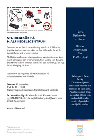 Kontaktuppgifter: Västerås Stads Kontaktcenter, tfn 021-39 27 25 eller via mejl anhorigstod@vasteras.se