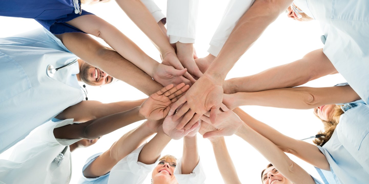 Sjukvårdspersonal står i cirkel och sträcker sina händer mot mitten