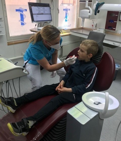 Barn i behandlingsrum med tandläkare