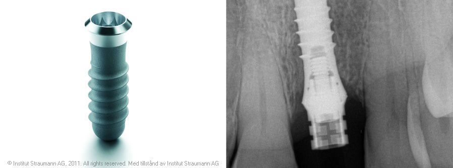 Vid enstaka eller mer omfattande tandförluster kan man med implantat på ett skonsamt sätt återskapa estetik och funktion. Vi arbetar sedan 1994 med implantat från Straumann ITI som vi har en mycket god erfarenhet av. En stor fördel med detta system är att det bara behövs en operation.